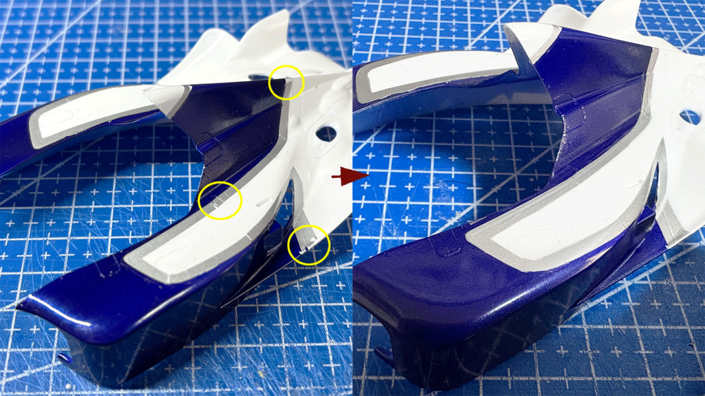 乾いてからクリア3回ほど吹いてから#1500ペーパーで軽くヤスってからシルバーを吹きました。