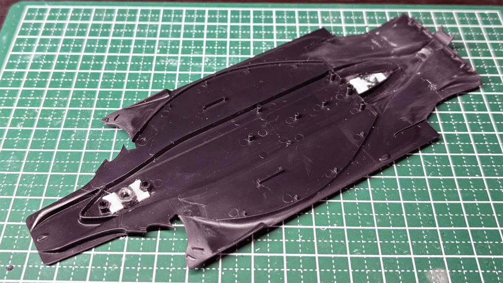 ディスプレイに車体を止めるためにシャーシ裏にナットを接着します。