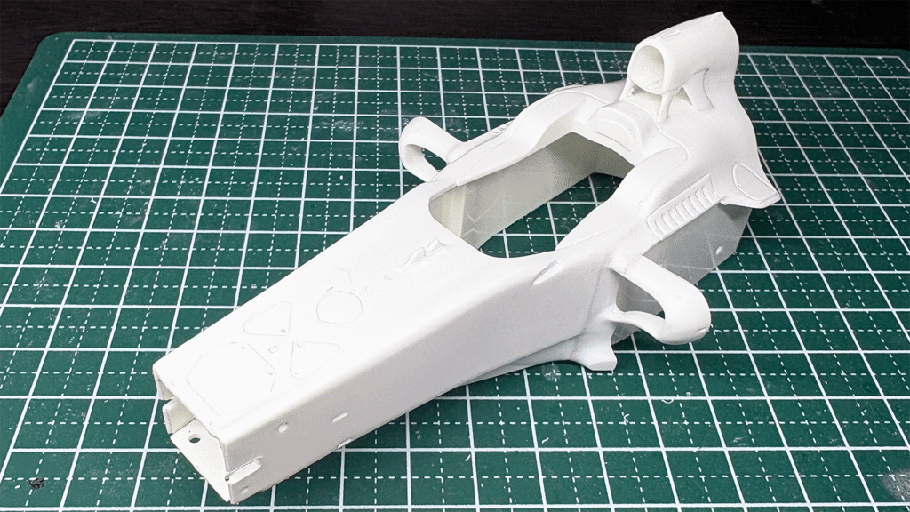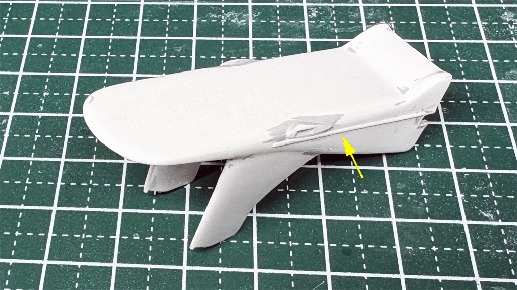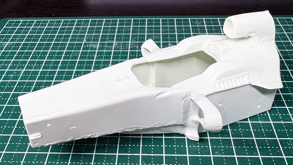 その後、グレーサフを全体に吹いて傷や凹み、つなぎ目の消し忘れ等を見えやすくして、再度#1000 ペーパーをかけます。