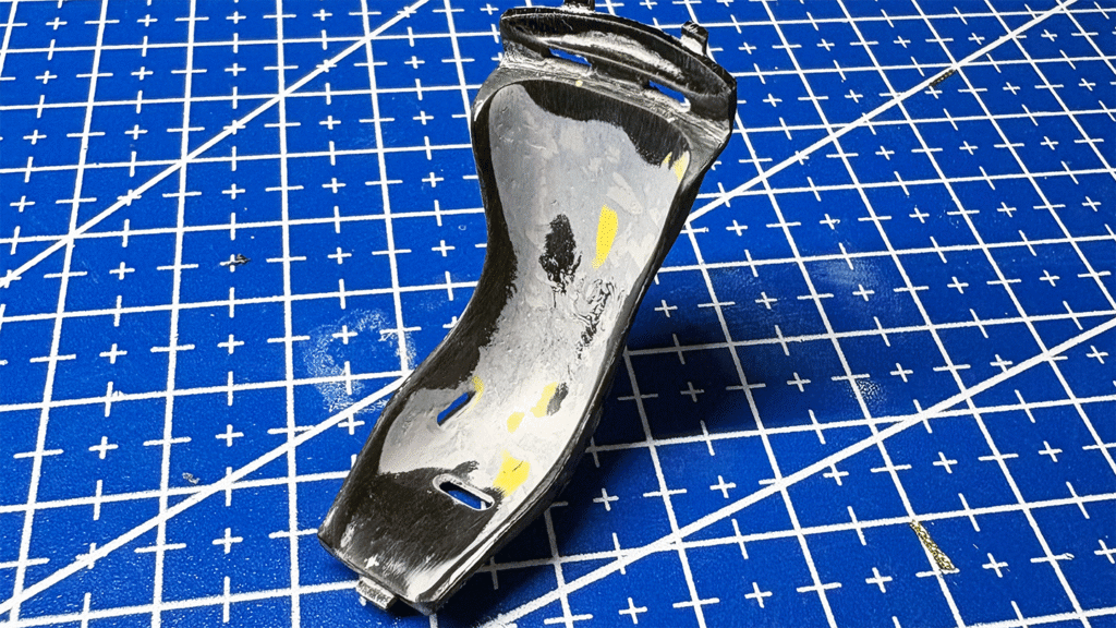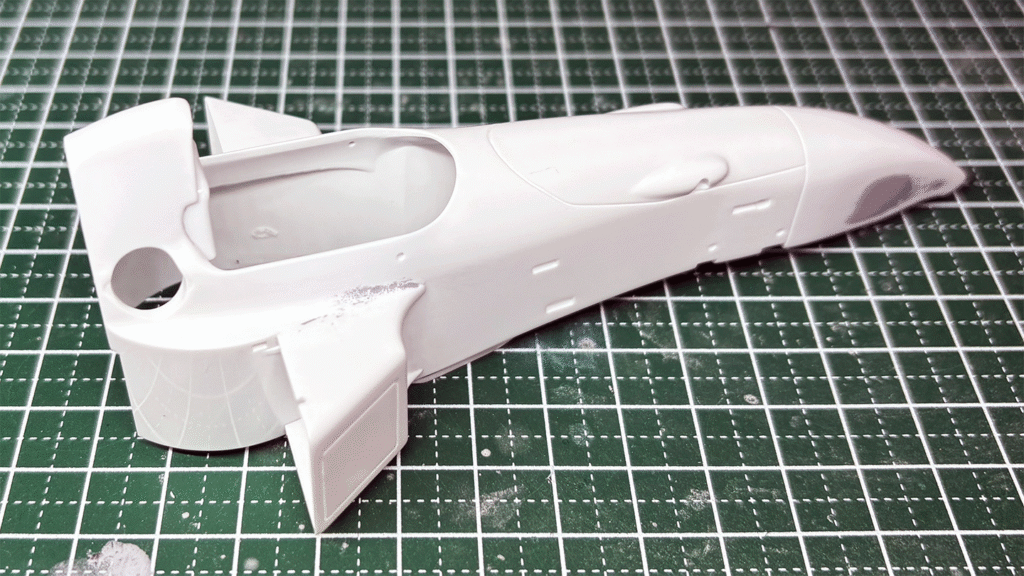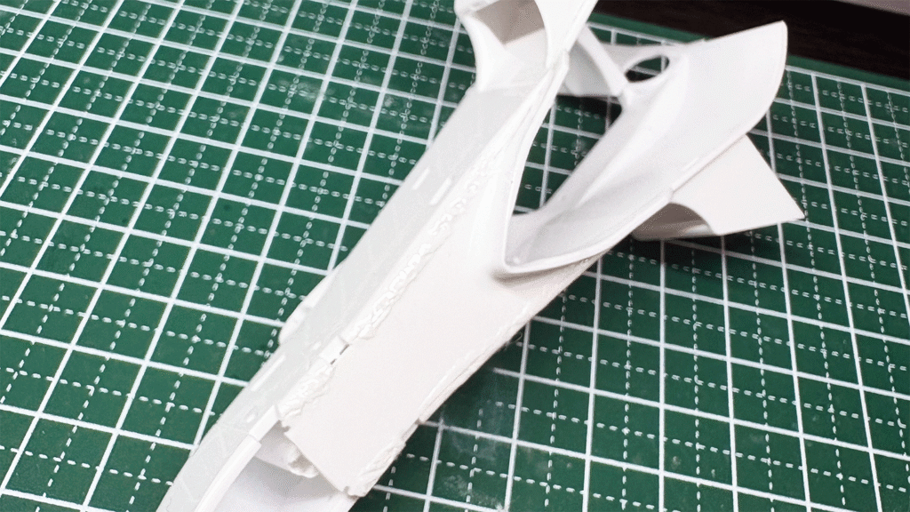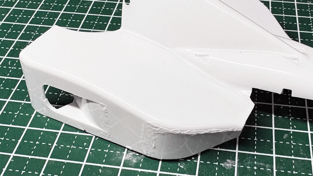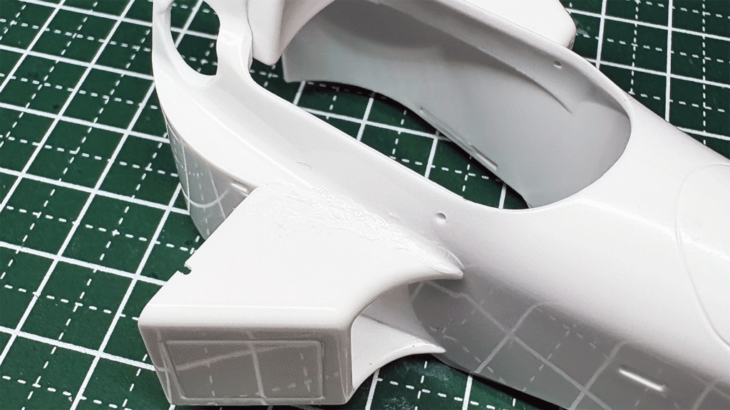 プラモデル用ノミで削り、ペーパーやすりをかけ、凸凹になったシートをポロパテとタミヤパテで埋めて、また、ペーパーをかける。