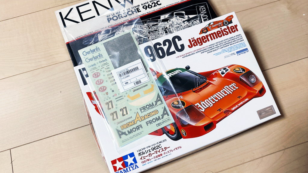 ポルシェ962イェーガーマイスターを購入、後ろに見えている未完成ポルシェ956のパールを流用してフルビューモデルを作ろうと思います。